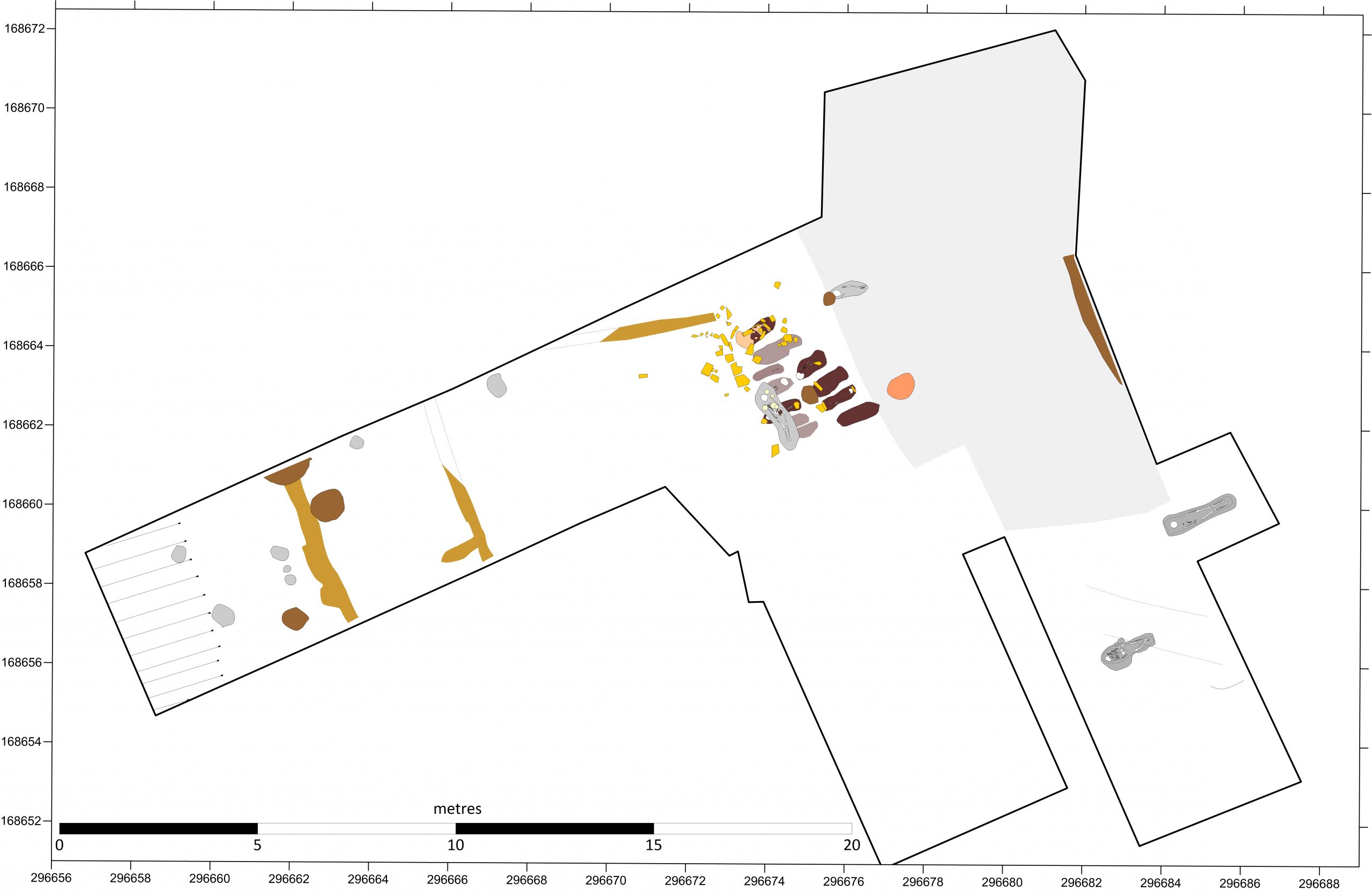 In Trench 4 the W arm produced several features, including a posthole, an elongate hearth and various less-easily interpreted circular and linear cuts. An additional four infant graves were investigated in the central area. The upper deliberate fills in the complex feature in the SE area were partially removed – to reveal an unexpected adult burial in a grave sealed by the heavy stone and metallurgical waste of the dumped material.
